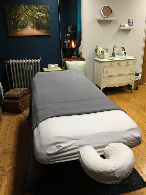 In-studio amenities: Candles, Drinking Water, Heated Massage Table, Hot Towels, Massage Table, Metered Parking, Music