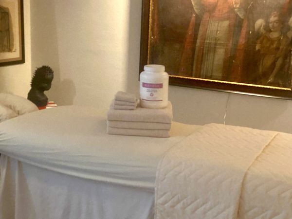 In-studio amenities: Bottled Water, Candles, Drinking Water, Free Parking, Heated Massage Table, Hot Towels, Massage Table, Music, Private Restroom, Shower