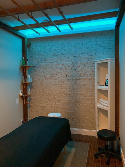 In-studio amenities: Candles, Drinking Water, Massage Table, Music