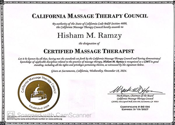 I'm Hisham, a Certified Massage Therapist (CMT) with the California Massage Therapy Council (CAMTC Certification #86194) and a graduate of the National Holistic Institute. I'm also a member of the American Massage Therapy Association (AMTA #1849760), located in Los Angeles.