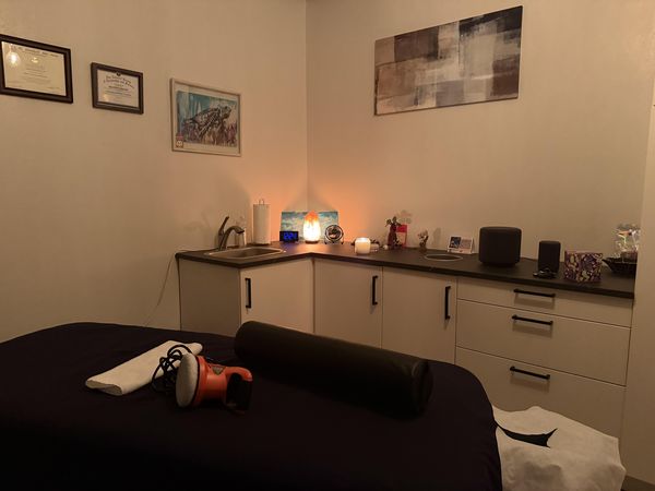 In-studio amenities: Bottled Water, Free Parking, Heated Massage Table, Massage Table, Music, Private Restroom