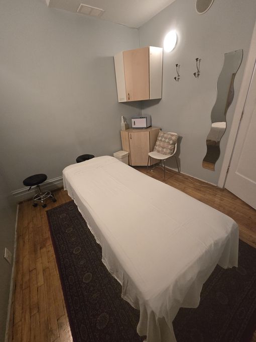 In-studio amenities: Drinking Water, Heated Massage Table, Hot Towels, Massage Table, Music, Private Restroom