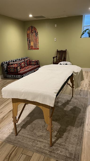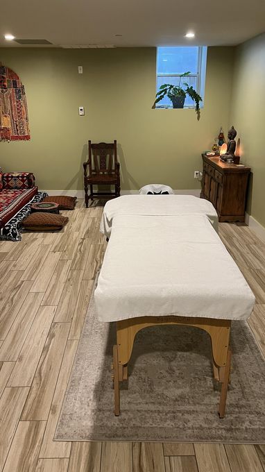 In-studio amenities: Candles, Drinking Water, Massage Table, Music, Private Restroom, Shower, Tea