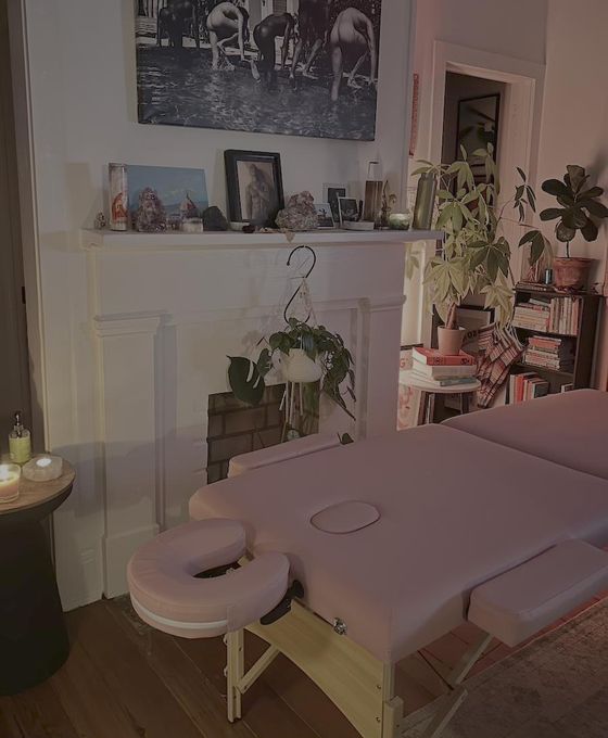 In-studio amenities: Candles, Drinking Water, Massage Table, Music, Private Restroom, Tea