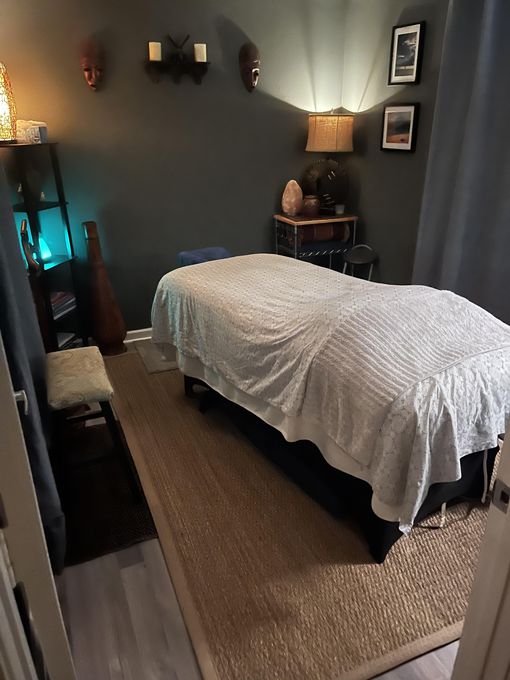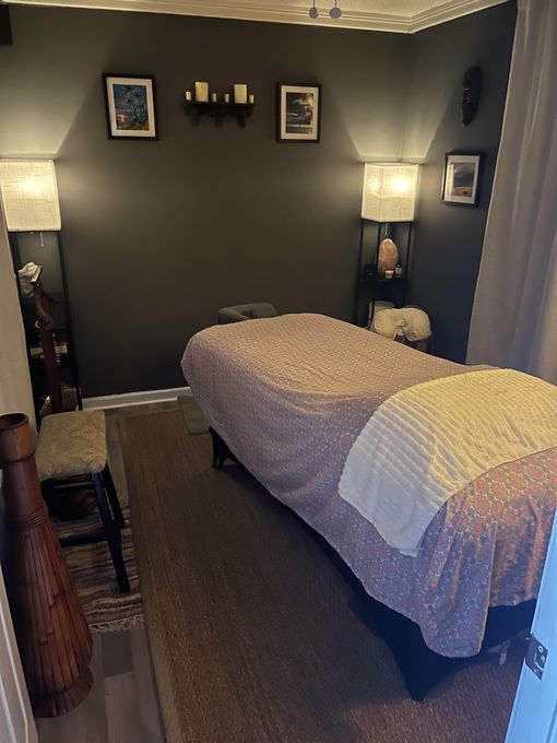 In-studio amenities: Bottled Water, Free Parking, Heated Massage Table, Massage Table, Music, Private Restroom